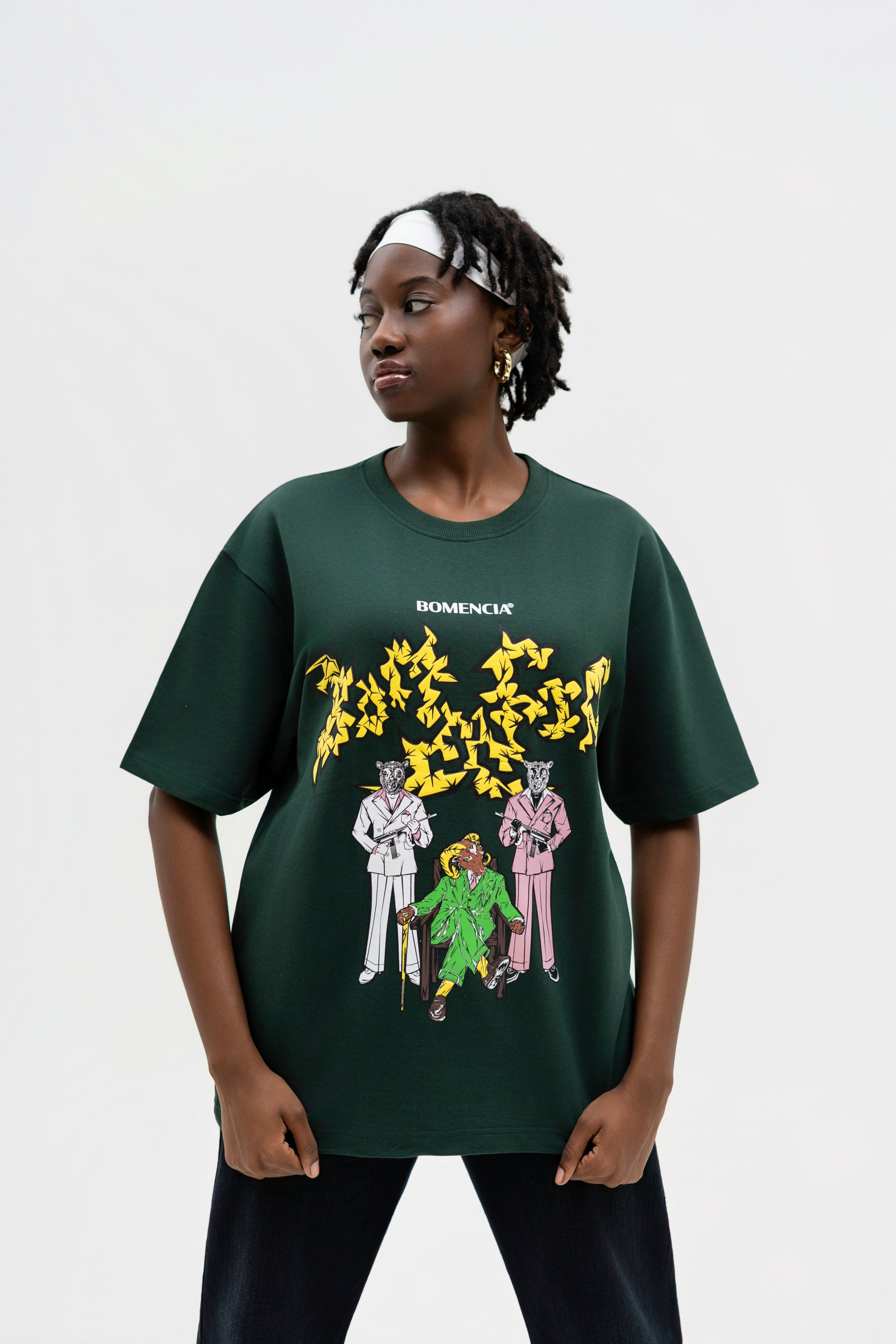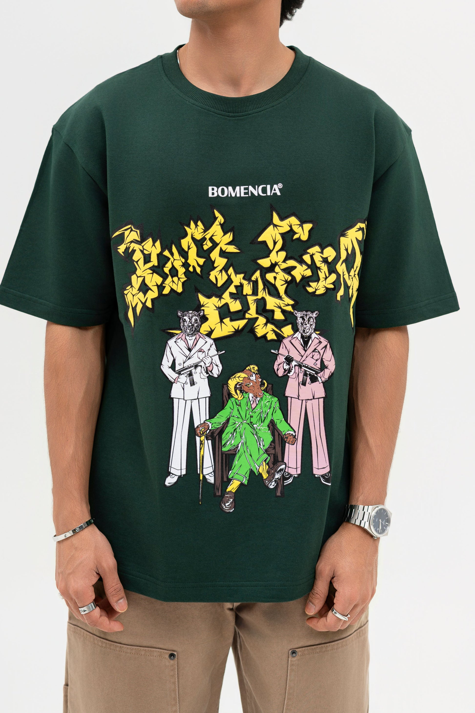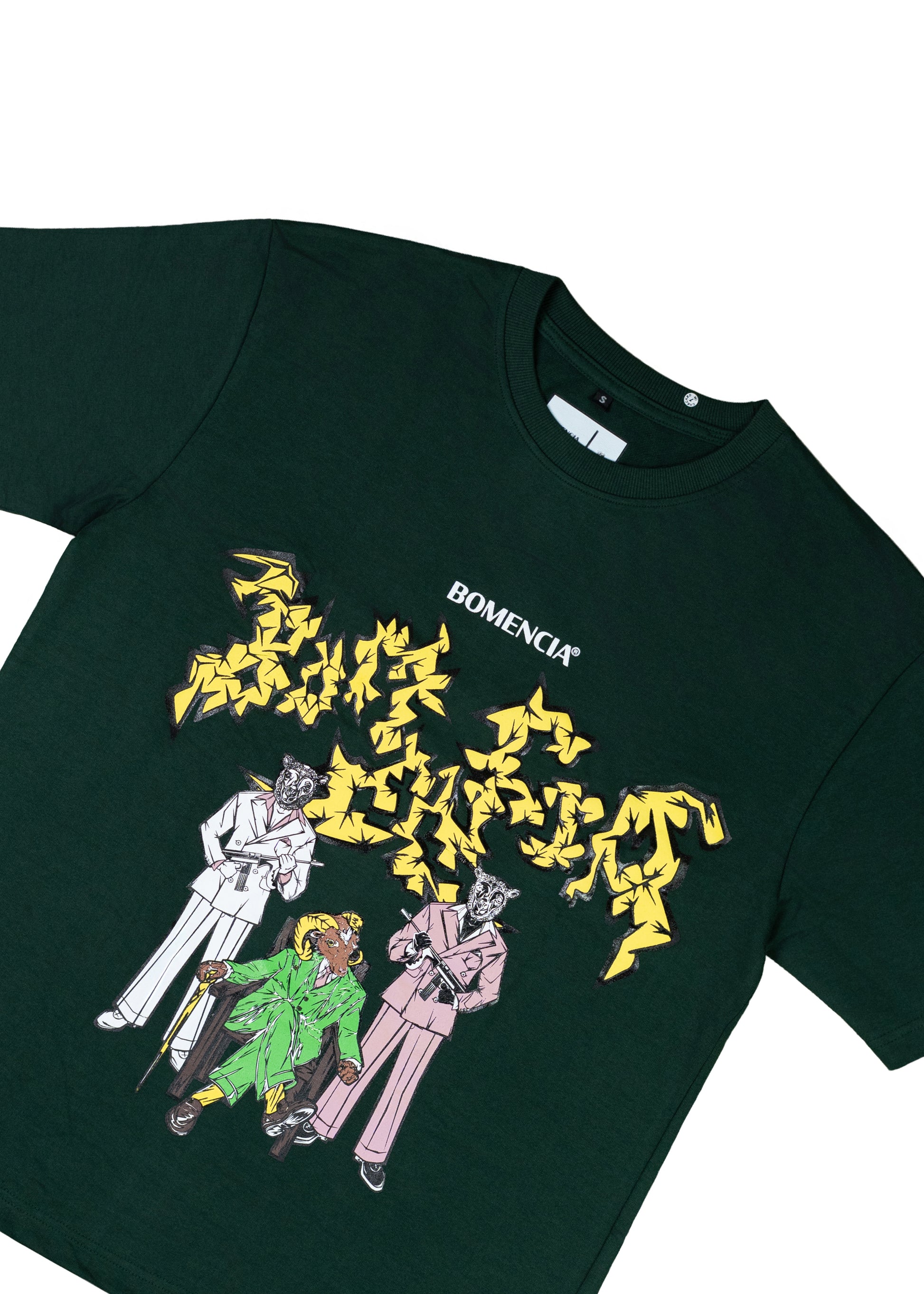 THE DEEP BOTTLE GREEN BASE SETS THE CANVAS FOR A STRIKING NARRATIVE ARTWORK: A MOUNTAIN GOAT BOSS FLANKED BY BLACK AND WHITE SHEEP GUARDS WIELDING MACHINE GUNS. EXECUTED IN A MIX OF PUFF AND SCREEN PRINT, TOGETHER THEY FORM THE GRASS LAND GANG—A SURREAL FUSION OF POWER, LOYALTY, AND REBELLION DRAWN STRAIGHT FROM THE WILD.