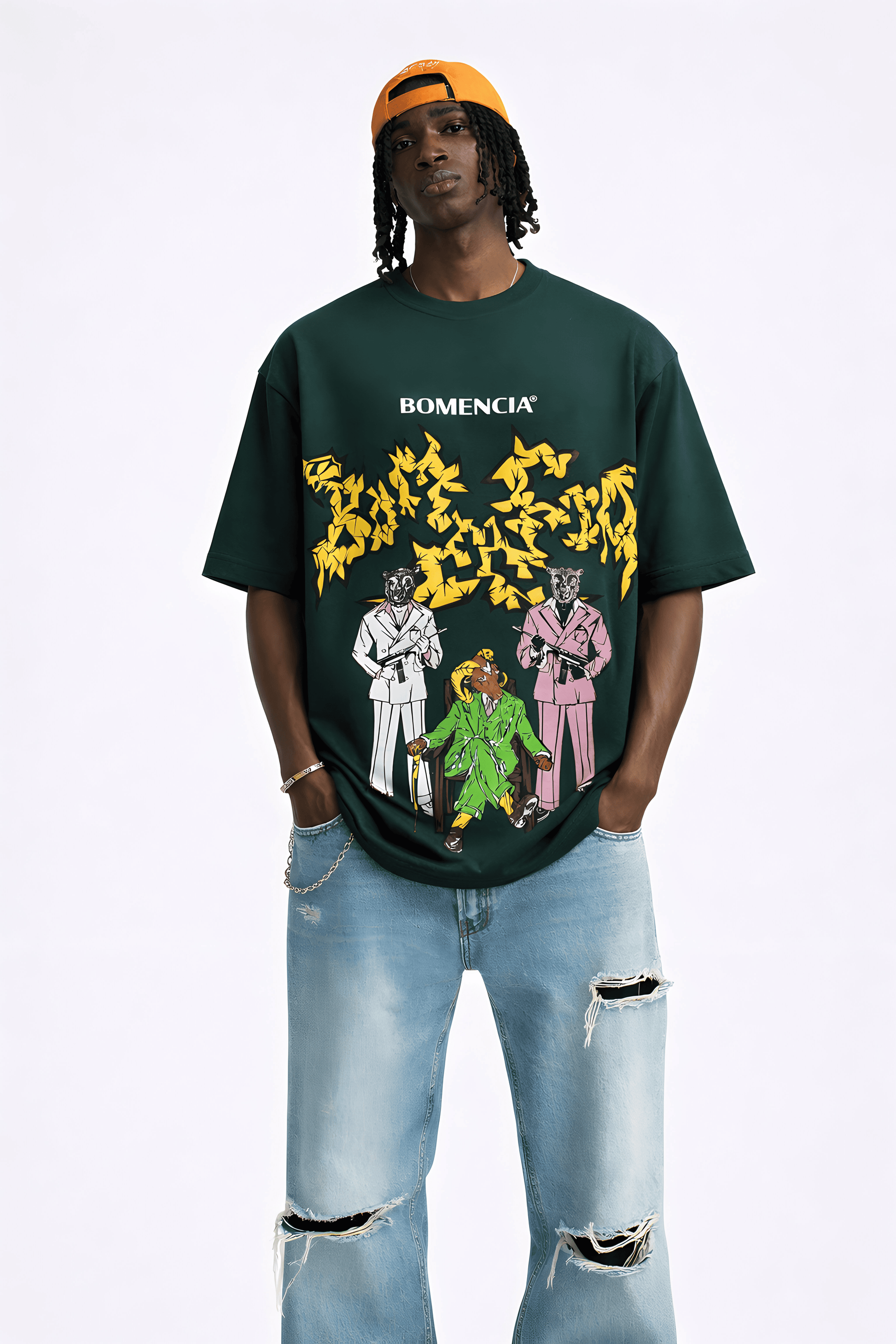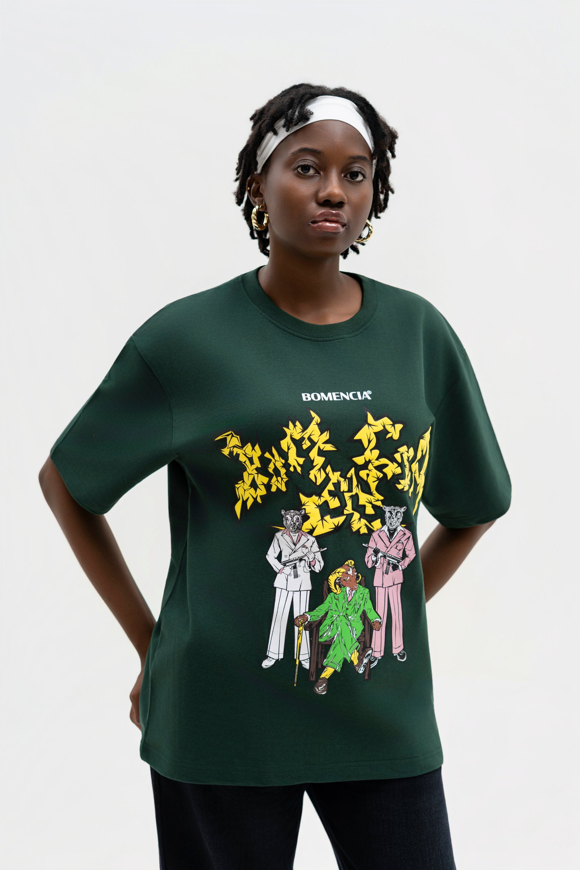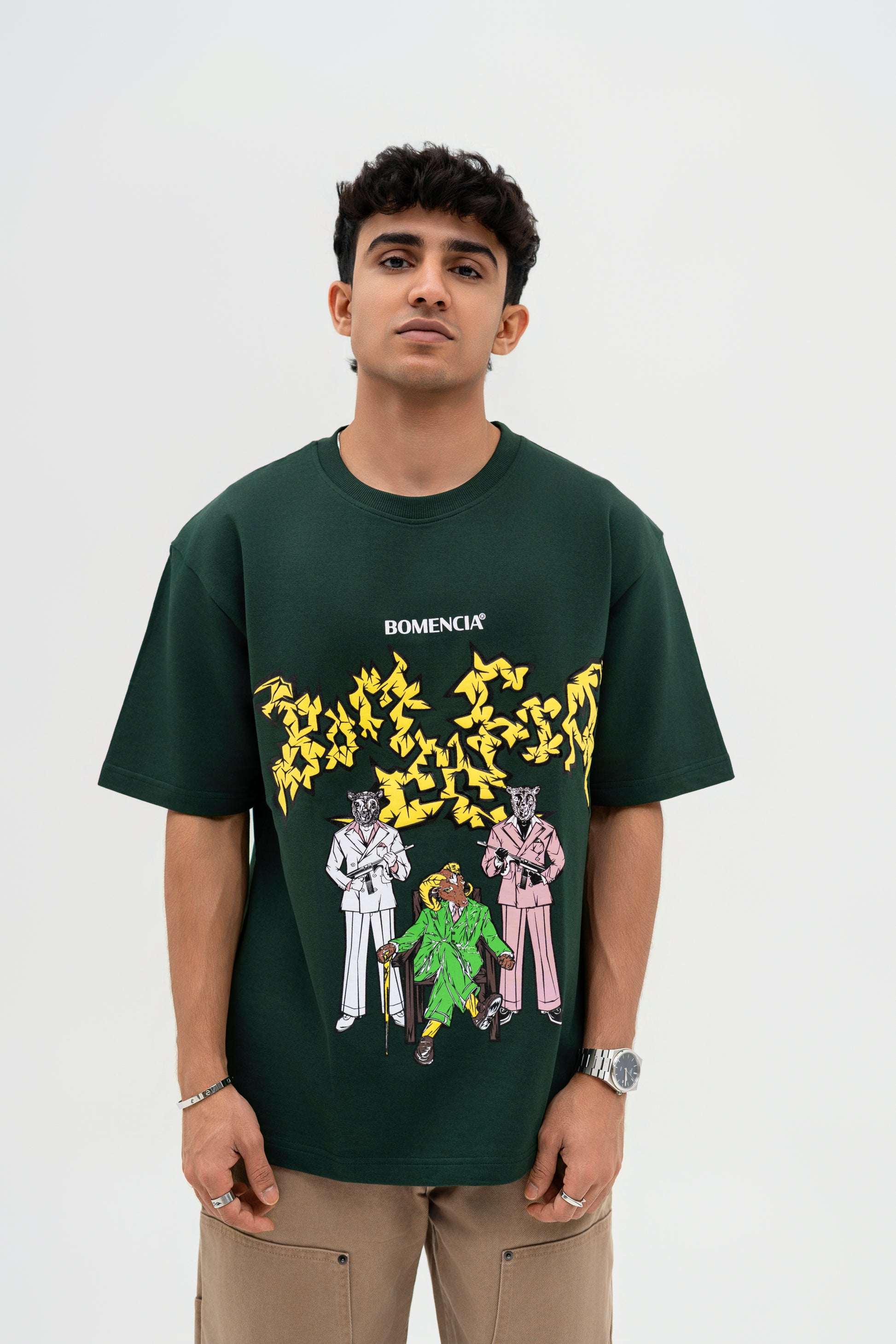 THE DEEP BOTTLE GREEN BASE SETS THE CANVAS FOR A STRIKING NARRATIVE ARTWORK: A MOUNTAIN GOAT BOSS FLANKED BY BLACK AND WHITE SHEEP GUARDS WIELDING MACHINE GUNS. EXECUTED IN A MIX OF PUFF AND SCREEN PRINT, TOGETHER THEY FORM THE GRASS LAND GANG—A SURREAL FUSION OF POWER, LOYALTY, AND REBELLION DRAWN STRAIGHT FROM THE WILD.